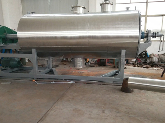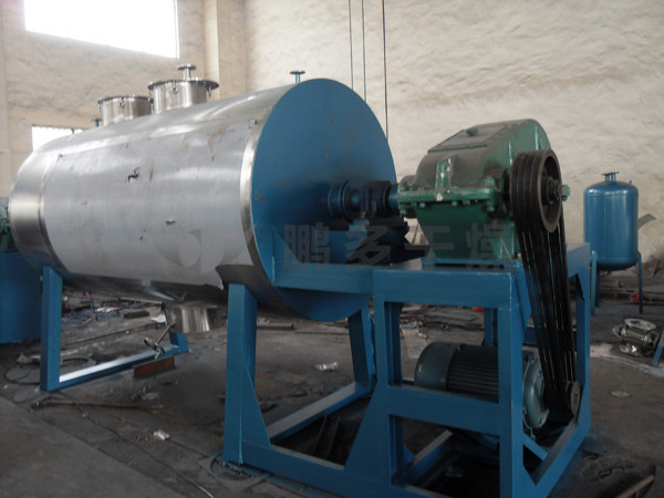 本機是一種新穎臥式間歇式真空干燥設(shè)備,濕物料經(jīng)傳導(dǎo)蒸發(fā),帶有刮板攪拌器不斷清除熱面上的物料,并在容器內(nèi)推移形成循環(huán)流,水份蒸發(fā)后由真空泵抽出。