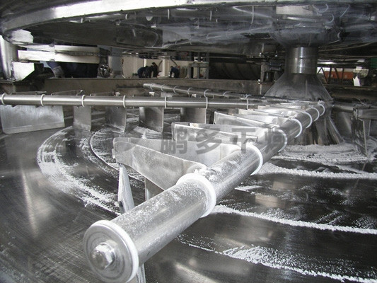 濕物料自加料器連續(xù)地加到干燥器上部第一層干燥盤上,帶有耙葉的耙臂作回轉(zhuǎn)運(yùn)動(dòng)使耙臂作回轉(zhuǎn)運(yùn)動(dòng)使耙葉連續(xù)地翻抄物料。物料沿指數(shù)螺旋線流過干燥盤表面,在小干燥盤上的物料被移送到外緣,并在外緣落到下方的大干燥盤外緣,在大干盤上物料向里移動(dòng)并從中間落料口落如下一層小干燥盤中。大小干燥盤上下交替排列,物料得以連續(xù)地流過整個(gè)干燥器。中空的干燥盤內(nèi)通入加熱介質(zhì),加熱介質(zhì)形式有飽和蒸汽、熱水和導(dǎo)熱油,加熱介質(zhì)由干燥盤的一端進(jìn)入,從另一端導(dǎo)出。已干物料從最后一層干燥盤落到殼體的底層,最后被耙葉移送到出料口排出。濕份從物料中逸出,由設(shè)在頂蓋上的排濕口排出,真空型盤式干燥器的濕氣由設(shè)在頂蓋上的真空泵口排出。從底層排出的干物料可直接包裝。通過配加翅片加熱器、溶劑回收冷凝器、袋式除塵器、干料返混機(jī)構(gòu)、引風(fēng)機(jī)等輔機(jī),可提高其干燥的生產(chǎn)能力,干燥膏糊狀和熱敏性物 料,可方便地回收溶劑,并能進(jìn)行熱解和反應(yīng)操作。