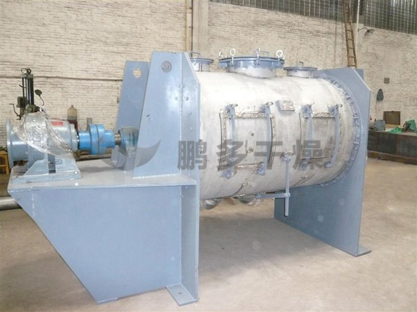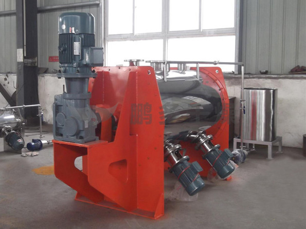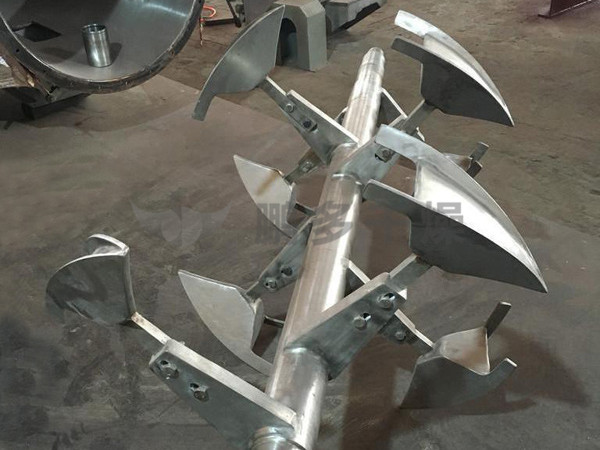 該機型由傳動機構(gòu)、臥式筒體、犁刀、飛刀四部分組成,物料在犁刀作用下沿筒壁作軸向流支,當(dāng)物料流經(jīng)飛刀時被高速度旋轉(zhuǎn)的飛刀拋灑,從而在較短時間內(nèi)達到均勻混合。