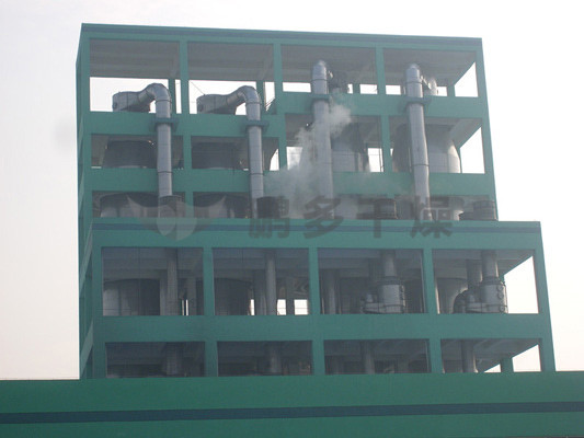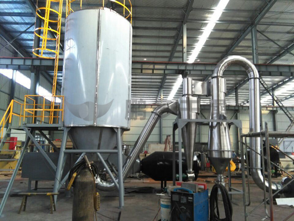 本機組工作過程為料液通過隔膜泵高壓輸入,噴出霧狀液滴,然后同熱空氣并流下降,大部分粉粒由塔底排料口收集,廢氣及其微小粉末經(jīng)旋風分離器分離,廢氣由抽風機排出,粉末由設(shè)在旋風分離器下端的授粉筒收集,風機出口還可裝備二級除塵裝置,回收率在96-98%以上。